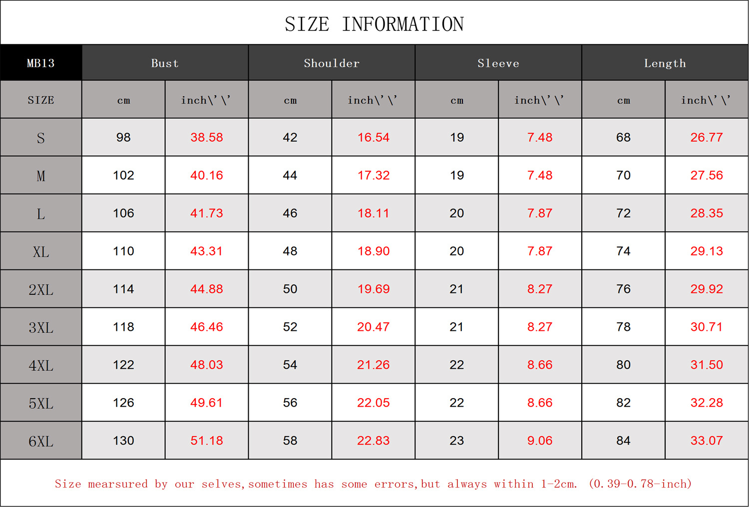 Sizes: S, M, L, XL, 2XL, 3XL, 4XL, 5XL, 6XL